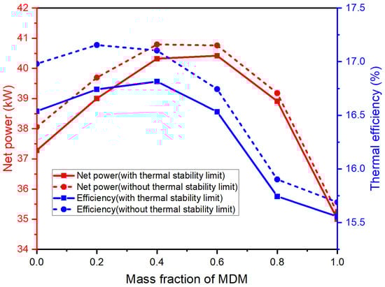 The variation trend of net power and thermal efficiency with different mass fractions of MDM.
