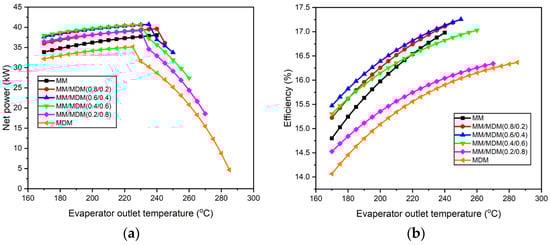 The results, depicted in Figure 8, demonstrated that certain mixtures noticeably outperformed the pure working fluid in terms of net power and thermal efficiency. Moreover, it was also observed that both the net power and thermal efficiency underwent a decline when the evaporation temperature was limited to 220 °C. While the reduction in net power was relatively limited, a significant decrease was observed in the thermal efficiency. The maximum net power without thermal stability limit was 40.79 kW with the MDM mass fraction of 0.4. While considering the thermal stability limit, the maximum net power was 40.42 kW with the MDM mass fraction of 0.6. The relative decrease was 0.92%. The maximum thermal efficiency without thermal stability limit was 17.16% and occurred in the MDM mass fraction of 0.2, while that with thermal stability limit was 16.82% and occurred in the MDM mass fraction of 0.4 by a relative decrease of 1.98%.