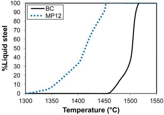 Calculated solidification curves for MP12 and BC weld metal compositions.