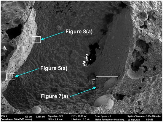Here, as in the authors’ recent similar studies, the methods of SEM (scanning electron microscope) imaging and EDS (energy dispersive X-ray spectroscopy) analyses were applied to the 3D post-weld slags [9,17,18,35]. The prior studies confirmed the presence of three-dimensional (3D) structures in the post-weld slags, and showed that these structures formed from vaporisation and re-condensation of oxy-fluorides [9,17,18,35]. In this study, similar 3D structures were observed in the dome cavities within the post-weld slag. Figure 4 shows the low magnification BSE (backscattered electron image) image of a large dome cavity with 3D structures embedded in the dome walls. The blocked dome wall areas in Figure 4 are shown at larger magnifications in Figure 5a, Figure 6a, Figure 7a and Figure 8a.