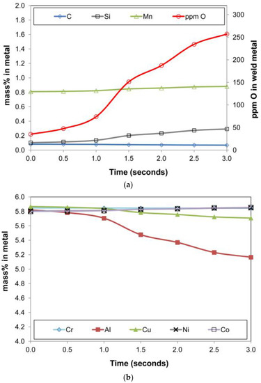 The metal phase %Cu in Figure 11b decreased over time, in line with the vaporisation of copper as shown in the gas phase chemistry in Figure 13a. The presence of both Cu(g) and Na(g) in the gas phase in Figure 13 is in agreement with the specific association of copper and sodium in the oxy-fluoride condensation patterns observed on the surface of 3D spherical structures of 2 µm diameter in the Al-Co-Cr-Cu metal powder addition weld [18]. The vaporisation of chromium is shown in Figure 13b, although the effect on the metal phase composition is limited. The model prediction for nickel and cobalt vaporisation is low since less than 0.5% of these elements are reflected in the gas composition. High concentrations of metal phase elements in the gas phase are Fe, Mn, and Si as SiO(g). The model predicted values of %Si and %Mn in the metal phase are lower than the analysed values. Therefore, the model may need refinement on the Mn and Si mass transfer effects since there appears to be too much SiO(g) and Mn(g) formation in the model calculation.