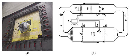Test system. (a) Fan outlet. (b) Test system diagram: 1 tested fan, 2 laser velocimeter, 3 negative pressure chamber, 4 positive pressure chamber, 5 pressure sensor, 6 temperature sensor, 7 auxiliary fan, 8 rectifier plate, 9 nozzle adjustment device, 10 air inlet pipe, 11 air outlet pipe, 12 general control console.