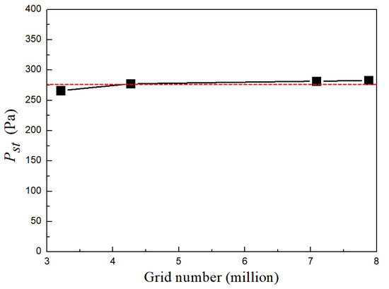 This study investigates the impact of installation heights on the performances of centrifugal fans through experimental and numerical simulation methods. The commercially available software Fluent was used to conduct modeling and simulation. The grid-independence tests using 3.21 million, 4.27 million, 7.09 million, and 7.88 million mesh systems are shown in Figure 4. The red dotted line indicates the experimental data. The 7.45 million scheme was chosen for its economic CPU time and ability to achieve a static pressure error of less than 1%.