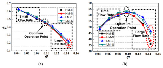 Comparison of experimental and simulation results. (a) Static pressure coefficient—flow rate; (b) static pressure efficiency—flow rate.