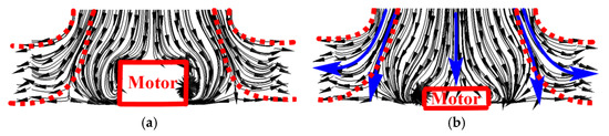 Streamline on the meridian plane of the fan under a low flow rate. (a) Original model; (b) low-motor model.