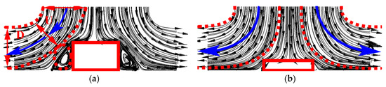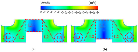 The flow coefficient was set to 0.145, a higher flow rate. As shown in Figure 8a, the upper surface of the motor is oriented perpendicular to the direction of flow. Both sides of the higher motor are simplified into a stepped structure, which is favorable for the formation of vortexes on the motor sides. The axial height of these vortices is approximately equal to that of the motor. Vortexes in middle passage can easily reduce the effective impeller area within the flow channel, where they are accelerated initially and decelerate subsequently as they pass through the impeller. From Figure 8a, it is evident that the cross-sectional areas in the middle flow channel are smaller than both the inlet and outlet of the impeller, leading to an acceleration section (U) and a deceleration section (D). In Figure 8b, the flow channel in the lower motor model is slightly affected by the motor due to the smaller length of both the impeller and vortex; this aligns with the predictions made by the authors of Ref. [4].