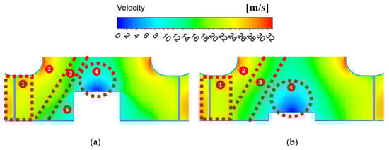 The analysis presented in Figure 9 clearly demonstrates that variations in installation height have no significant impact on the velocity distributions within the first zone. Although the low-motor model also exhibits a low-speed region 4, due to its lower motor height, the region 4 is close to the wheel and smaller at the bottom of the impeller. This observation provides further depth and insight into our understanding of how installation heights influence velocity distributions within different regions.