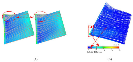 Figure 11 shows a comparison of blade surface streamlines, where LE denotes the leading edge position of the blades. The differences in blade streamlines, resulting from the two installation conditions, were observed near the shroud of the leading edge blade, with a larger vortex in the original model. Velocity differences ranging from 6 to 13 (m/s) were observed at the leading edge of the blade near the hub side, while other parts of the blade surface are close to 0 (m/s). This indicates that variations in motor installation height primarily affect the leading edge of the blade.