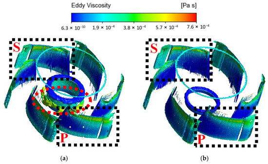 Figure 12 shows the vorticity distributions, indicating that the viscosity near the blade suction and pressure surfaces is similar for both installation heights. Notably, a vortex near motor in the original model is found, the viscosity of which is similar to the maximum viscosity on the blade suction surface. Therefore, this impacts the flow within the impeller, resulting in the consideration of flow losses. Our study revealed that differences in flow losses are primarily concentrated near the motor.