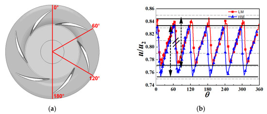 The velocity distribution at the impeller outlet on the radial plane is compared in Figure 13, where u2 represents the circumferential velocity. The abscissa denotes the circumferential angle of the radial plane, and its angular azimuth is shown in Figure 13a. As a result of weakened velocity fluctuation in the low-motor model, flow losses caused by jet wake are reduced. The intensity of jet wake at the blade channel outlet has a significant impact on fan performance.