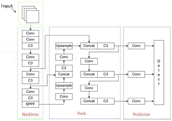 Neck: The neck structure resides between the backbone and head and adopts the PAN algorithm []. The PAN algorithm consists of convolutional and upsampling layers, aiming to increase feature resolution and fuse features of different scales. Additionally, PAN combines backbone features of different scales to enhance feature representation capabilities further.