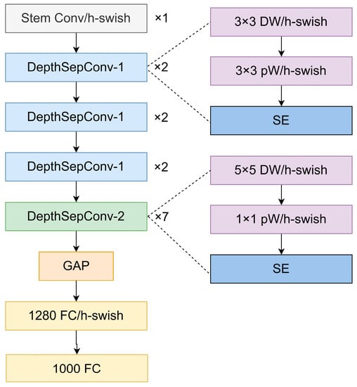 - Howard, A.; Sandler, M.; Chu, G.; Chen, L.C.; Chen, B.; Tan, M.; Wang, W.; Zhu, Y.; Pang, R.; Vasudevan, V.; et al. Searching for mobilenetv3. In Proceedings of the IEEE/CVF International Conference on Computer Vision, Seoul, Republic of Korea, 27 October–2 November 2019; pp. 1314–1324. [Google Scholar]