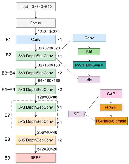 As shown in Figure 4, the improved backbone structure can be divided into nine parts (B1 to B9). Among them, B1 is a module that uses 3 × 3 ordinary convolutions for feature extraction, primarily focused on extracting low-level features from the input image. B2 to B8 consists of depth separable convolutions (DepthSepConv) to reduce model parameters and network computation, thereby enhancing computational efficiency. The DepthSepConv mainly consists of structures such as batch normalization (BN), pointwise convolution (PW), and squeeze-and-excitation (SE) blocks. B2 to B7, along with the first convolutional layer of B7, adopt a convolution kernel size of 3 × 3, while the subsequent five layers of convolution in B5 and all convolutional layers in B7 use a kernel size of 5 × 5. Batch normalization and activation functions are applied to the modules B2 to B7 to increase the non-linear mapping capability of the network and enable it to capture complex patterns in the data. The B8 module introduces the SE block to enhance salient features and suppress unimportant ones, thereby improving its discriminative power. The B9 module corresponds to the SPPF (spatial pyramid pooling fusion) layer in the original backbone, which performs pooling operations of four different sizes (1 × 1, 2 × 2, 3 × 3, and 6 × 6) on the input feature map and concatenates the pooled feature maps together. Based on this, the SPPF layer can perceive objects at different scales and retain high-level semantic information from the feature maps. Compared to CSPNet, the PP-LCNet structure is more straightforward, easier to train, and performs better in detecting large-scale objects.