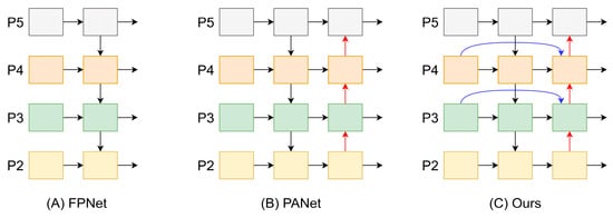In the original yolov5s, two feature pyramid networks, PAN (path aggregation network), and FPN (feature pyramid network), are used for feature fusion across layers to integrate features from different scales. As shown in Figure 5A), FPN integrates feature maps of varying resolutions by establishing connections from the top to the bottom of the network. This allows the fusion of high-resolution feature maps from the bottom with low-resolution feature maps from the top, ultimately enhancing the detection accuracy for small objects. As depicted in Figure 5B), PAN adopts a bottom-up and top-down feature fusion approach to restore low-resolution feature maps to the original resolution, but it requires more computational resources. In the case of railway switch detection, the small size of the targets necessitates an improvement in the detection accuracy of the original model. Feature pyramid networks, while beneficial for object detection, may fail to capture fine-grained details, decreasing detection performance.