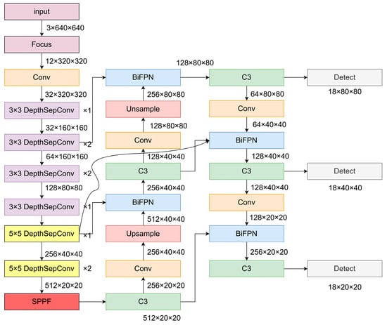 BiFPN (bidirectional feature pyramid network) [] is an effective method for multi-scale feature fusion that combines feature pyramid networks with bidirectional connections. This fusion technique aims to enhance both detection accuracy and efficiency. Feature pyramid networks enhance object detection accuracy by fusing features of different scales []. At the same time, bidirectional connections consider information from both high-level and low-level features, capturing target-specific characteristics more effectively. In BiFPN, each input feature undergoes two convolution operations and a weighted operation separately to extract more useful information from different layers and effectively fuse features of different scales. Furthermore, BiFPN introduces a dynamic weight assignment mechanism that dynamically adjusts the weights between features based on their performance, better-utilizing information from different features. During multi-layer bidirectional connections, BiFPN effectively utilizes information from different levels and facilitates information exchange between different scales [].