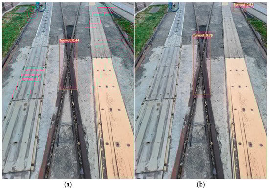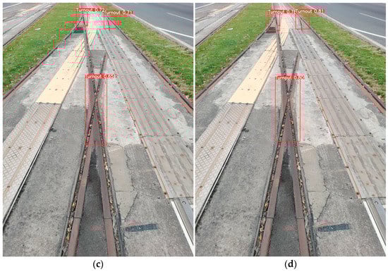 Finally, in this study, a validation dataset was collected that did not appear in the model training process. The best models trained using the original yolov5s and PBE-YOLO were used to detect images from this validation dataset, as shown in Figure 10. Through the experiments, it was found that the original yolov5s algorithm already achieved high accuracy during the training process. However, there is still significant room for improvement in performance in real-world detection scenarios. As shown in Figure 10a, it is evident that the baseline model yolov5s has missed detections. On the other hand, in Figure 10b, it is apparent that the improved yolov5s can accurately detect more miniature track switches. In Figure 10c, although the original yolov5s model can detect track switches in the image, the confidence scores for the detected objects are relatively low, ranging from 0.65 to 0.75. In contrast, the improved yolov5s model shows higher confidence scores (Figure 10d), ranging from 0.70 to 0.85, indicating that the improved yolov5s performs better in detecting track switches.