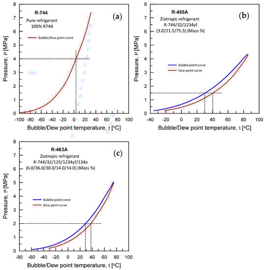 P-T envelopes of studied zeotropic refrigerants: (a) R-744, (b) R-455A, (c) R-463A.