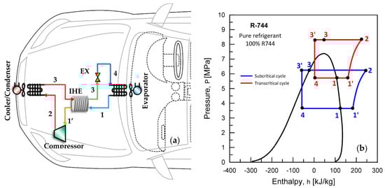 It is crucial to investigate and evaluate the performance of AACs cycles considering the physical and environmental characteristics of the newly studied zeotropic alternative refrigerants. Figure 2a illustrates the schematic diagram of the traditional vapor compression refrigeration cycle in AACs, comprising an evaporator, compressor, cooler/condenser, expansion valve, and internal heat exchanger. The following is a description of the system cycle: (i) 1′–2: non-isentropic compression; (ii) 2–3: constant pressure heat rejection from the cooler/condenser; (iii) 3–3′: subcooling in the internal heat exchanger (IHE); (iv) 3′–4: isenthalpic throttling in the expansion valve (EXV); (v) 4–1: constant pressure heat absorption in the evaporator; (vi) 1–1′: superheating in the internal heat exchanger (IHE). By adjusting the average evaporation temperature, cooler/condenser refrigerant output temperature, cooler/condenser pressure, and refrigerant mass flow rate, the operating conditions of the cycle can be modified. Because the critical point pressure of the refrigerant can be comparatively low compared to the cooler pressure, a transcritical model for the cycle was developed based on the operating conditions. In transcritical cycles, a gas cooler is utilized instead of a condenser, as in subcritical cycles, since there is no phase change above the critical point. As the pressure and temperature of the refrigerant are independent of each other, both pressure and temperature need to be defined at pressures above the critical point. The coefficient of performance of the cycle varies at the same gas cooler outlet temperature but different operating pressures. Therefore, the simulation model’s gas cooler was optimized by running it at the optimum gas cooler pressure []. Figure 2b presents the pressure-enthalpy (p-h) diagram of subcritical/transcritical cycles using R-744 in AACs.