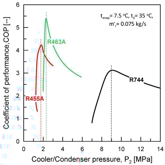 A transcritical/subcritical cycle was developed for R744, R455A, and R463A due to the critical temperatures of these refrigerants. In transcritical cycles, a gas cooler is used instead of a condenser since there is no phase change above the critical point. At pressures above the critical point, the pressure and temperature of the refrigerant become independent variables and both need to be specified. The coefficient of performance (COP) of the cycle is influenced by the cooler/condenser outlet temperature and the operating pressures. Figure 3 illustrates the optimum cooler/condenser pressure, P2, for the studied zeotropic refrigerants, R455A and R463A, compared to R744, based on the maximum COP of the cycle. The common operating conditions for the comparison are tevap = 7.5 °C, t3 = 35 °C, and ṁr = 0.075 kg/s. According to the figure, the maximum COP values achieved with R744, R455A, and R463A were 3.1, 4.25, and 5.4, respectively. These values were obtained at the optimum pressures of 8.9, 1.65, and 2.3 MPa for R744, R455A, and R463A, respectively.