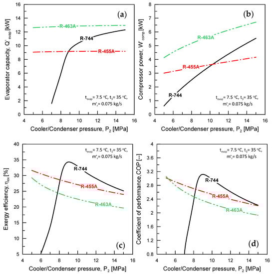 Figure 4 displays the variations of evaporator capacity (), compressor power (), exergy efficiency (ηex), and coefficient of performance (COP) with the cooler/condenser pressure (P2) at tevap = 7.5 °C, t3 = 35 °C, and ṁr = 0.075 kg/s. In Figure 4a, it is evident that as P2 increased, the evaporator capacity () sharply increased for R744, while it remained nearly constant for R455A and R463A. This behavior is due to the difference in refrigerant enthalpy through the evaporator. With R744, the refrigerant enthalpy decreased at the inlet of the evaporator, while it remained approximately constant for R455A and R463A as P2 increased. This is because the cycle is transcritical for R744 using a gas cooler, while it is subcritical for R455A and R463A using a condenser. Furthermore, R463A exhibited the highest evaporator capacity () among the three refrigerants, while R455A had a higher than R744 until P2 ≤ 8.9 MPa, after which R744 surpassed R455A. Figure 4b illustrates the compressor power () of R744, R455A, and R463A. It was observed that increased with an increase in the cooler/condenser pressure (P2). This behavior can be attributed to the thermodynamic relationship between pressure and temperature and the nature of the thermodynamic cycle.