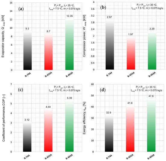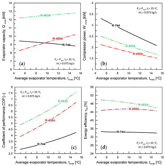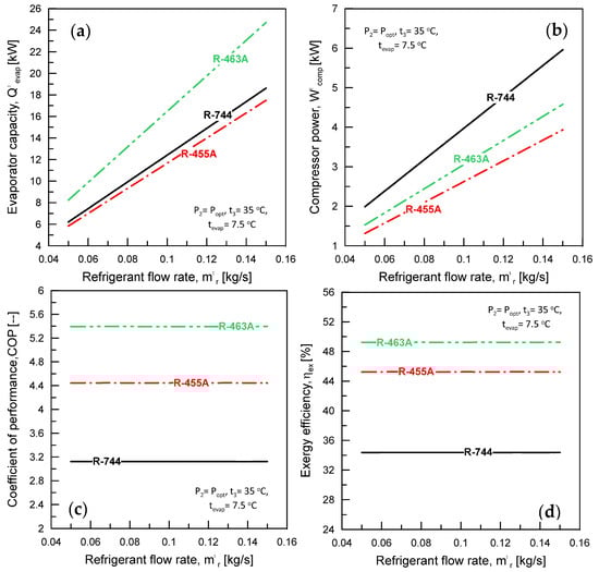 Figure 5 illustrates the impact of the average evaporator temperature (tevap) on the following key performance parameters: evaporator capacity (), compressor power (), exergy efficiency (ηex), and coefficient of performance (COP). The analysis was performed at a condenser temperature of t3 = 35 °C, mass flow rate of ṁr = 0.075 kg/s, and condenser pressure of P2 = Popt. The optimum pressures for R744, R455A, and R463A were 8.9, 1.65, and 2.3 MPa, respectively, as shown in Table 2. Table 2 also provides the critical pressures and temperatures for R744, R455A, and R463A, indicating that the R744 cycle operates in the transcritical region, while the cycles for R455A and R463A are in the subcritical region. The of R455A and R463A increased with rising tevap, while it decreased for R744. Additionally, the of R744 was higher than that of R455A until tevap reached 9 °C.