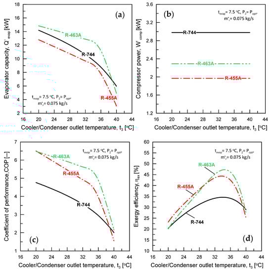 Figure 6 demonstrates the influence of cooler/condenser outlet temperature (t3) on the following performance parameters: evaporator capacity (), compressor power (), exergy efficiency (ηex), and coefficient of performance (COP). The analysis was conducted at a fixed average evaporator temperature of tevap = 7.5 °C, mass flow rate of ṁr = 0.075 kg/s, and condenser pressure of P2 = Popt. The optimum pressures for R744, R455A, and R463A were 8.9, 1.65, and 2.3 MPa, respectively. As shown in Figure 6a,c, the and COP decreased as the cooler/condenser outlet temperature (t3) increased for all refrigerants. Furthermore, the decline in and COP became more pronounced when t3 exceeded 35 °C. This phenomenon occurs due to the reduction in refrigerant enthalpy difference across the evaporator with increasing t3, while the compression work remained constant. Figure 6b indicates that t3 had no significant effect on compressor power () since the cooler/condenser pressure (P2) and average evaporator temperature (tevap) were fixed at their optimum values of 7.5 °C.