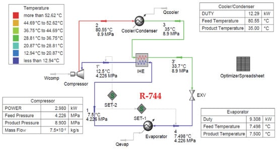 Figure 8 provides a cycle analysis and the state properties at the inlet and exit of each component for the R744 refrigerant using Aspen HYSYS software. The purpose of this analysis was to compare and assess the performance indicators of the Advanced Adiabatic Compressed Air Energy Storage (AACs) system when charged with pure R744 and with R455A and R463A blend refrigerants as working fluids. The selected performance indicators include evaporator capacity (), compressor power (), exergy efficiency (ηex), and coefficient of performance (COP).