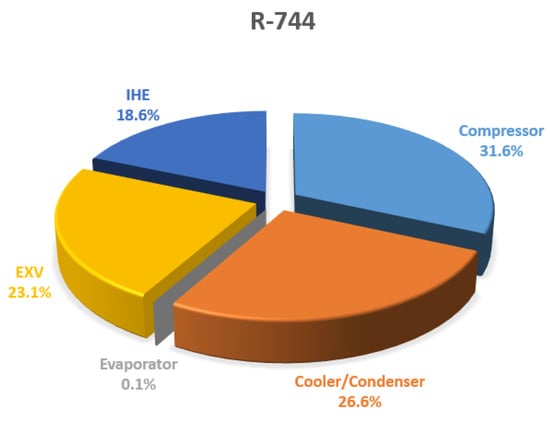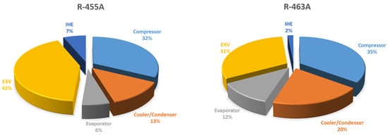 Figure 9 presents the system enhancements achieved with the different working fluids. It is evident that the blend R463A exhibited the highest values for , COP, and ηex, with values of 12.35 kW, 5.39, and 47.8%, respectively, surpassing both R744 and R455A. To further understand the system behavior, the percentage of exergy destruction for each component in the studied refrigerant blends compared to R744 is illustrated in Figure 10. This provides insight into the influence of each component on the overall exergy destruction. It can be observed that the expansion valve (EXV) contributed the highest irreversibility, accounting for 42% in the R455A cycle, followed by the compressor with 35% in the R463A cycle. The evaporator and condenser also contributed to exergy destruction in all configurations, albeit to a lesser extent. Overall, the findings from these analyses demonstrated the performance advantages and trade-offs associated with different refrigerant blends in the AACs system, highlighting the potential of R463A as the most promising option based on the evaluated performance indicators.