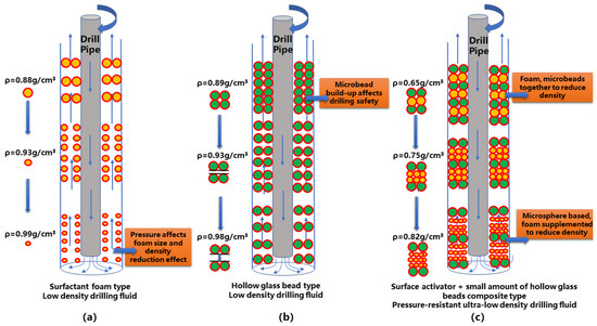 Ultra-low-density drilling fluid conceptual design. (a) shows the low-density drilling fluid with surfactant-based; (b) shows the low-density drilling fluid with hollow glass beads; (c) shows the ultra-low-density drilling fluid with the synergistic effect of hollow glass beads and surfactant; orange represents foam; green represents hollow glass beads and arrows represent the density change process.