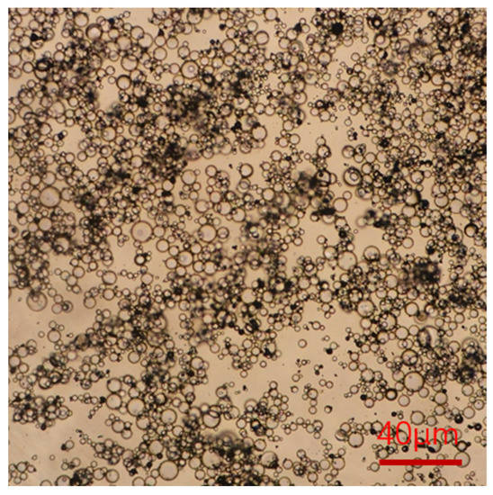 Drilling fluid with hollow glass microspheres has low density, high compressive strength, and is easily deployed; it can be applied to deep wells, and its density remains stable. As the microbeads have a round spherical shape and excellent fluidity, they have an excellent lubricating effect which can reduce the frictional resistance during the drilling process, while the hollow glass microspheres in the drilling fluid can be recycled and reused to reduce the production cost [25]. Figure 2 shows the magnification of hollow glass microspheres under the microscope (100× magnification).