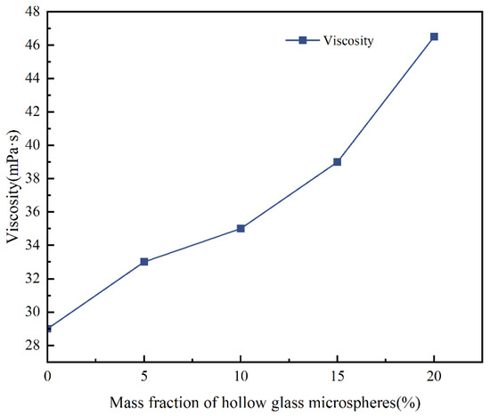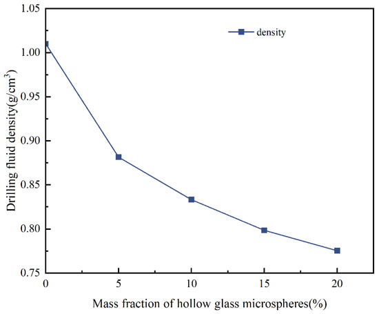 The effect of hollow glass microspheres on the density and rheology of drilling fluid was measured by adding different additions of hollow glass microspheres to the freshwater base slurry. As shown in Figure 3 and Figure 4, the drilling fluid density gradually decreases as the number of added hollow glass microspheres increases, while the viscosity of the drilling fluid shows a gradual increase. This is because the solid-phase content of the drilling fluid is larger, the relative surface area of the particles increases, and the friction between the particles becomes more frequent, resulting in a larger change in the rheological properties of the drilling fluid. From the overall view of the effect of hollow glass microspheres on drilling fluid, there is a significant decrease in density at the time of 5% addition and a steady decrease in density at the time of more than 5% addition, while the viscosity gradually increases with the increase in the number of hollow glass microspheres [17]. The drilling fluid density is 0.88 g/cm3, and the number of hollow glass microspheres can be controlled according to the required drilling fluid density and well depth in actual field application.