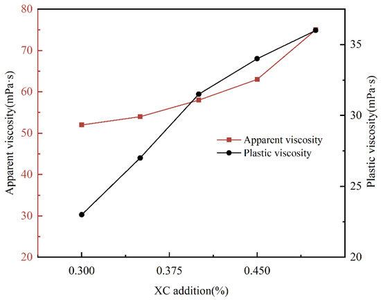 From the experimental results (Figure 5), it can be seen that with the continuous increase in the amount of XC, the drilling fluid viscosity increased from 52 mPs·s to 75 mPa·s and the shear force increased from 23 Pa to 34 Pa, indicating that the thickening effect of XC is relatively evident; the addition of more xanthan gum inhibits the foaming amount and performance. In this paper, the final choice of XC quantity for the experiment is 0.3%.