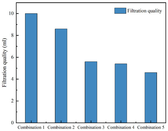 It can be seen from Figure 6 that starch can effectively reduce the filtration quality of drilling fluid, and the filtration quality reduction effect of high temperature-resistant filter loss reducing agents in this experimental system is better than that of sulfonated phenolic resin. Asphalt resin anti-collapse filtration quality reducer is a compound material of several filtration quality reducers which has a better filtration quality reduction ability, and after adding starch and high temperature-resistant filter loss-reducing agents, the filtration quality was reduced to 4.6 mL, which meets the drilling requirements.
