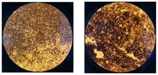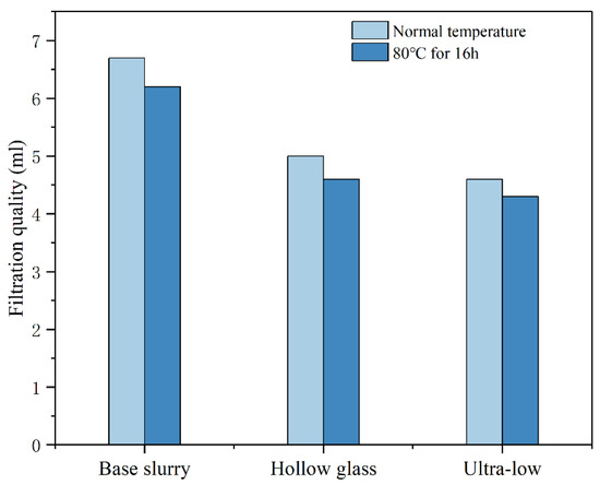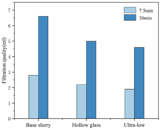 As shown in Figure 8 and Figure 9, with the addition of foaming agent the filtration quality is 1.9 mL at 7 min 30 s, which is 0.3 mL less than that of hollow glass microspheres drilling fluid, and at 30 min, the filtration quality of hollow glass microspheres drilling fluid is 5 mL and that of ultra-low-density drilling fluid is 4.6 mL, which indicates that the foaming agent and hollow glass microspheres can reduce the filtration quality in cooperation with other solid-phase particles in drilling fluid. Moreover, comparing the images of two low-density drilling fluids at 100× microscope magnification revealed that the low-density drilling fluid with only hollow glass microspheres as a mitigant had scattered solid-phase particles between the drilling fluids with well-defined aggregation, while the ultra-low-density drilling fluid was seen to form a mesh-like structure under microscope magnification, which aggregated the hollow glass microspheres with the foam and could well play a synergistic role in reducing the filtration quality [30]. In Figure 10, it can be seen that the ultra-low-density drilling fluid has a low filtration quality which further decreases due to the addition of high-temperature filtration quality-reducing agents.
