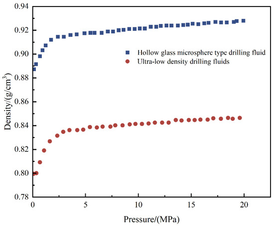 From Figure 11 above, we can see that the ultra-low-density drilling fluid is more compressible and the hollow glass microsphere-type drilling fluid is denser and less compressible. This is mainly because the foam can compress moderately with the pressure after adding the foaming agent and can repeat this pressurization and decompression in a shorter period. Compared to hollow glass microsphere-type drilling fluids, ultra-low-density drilling fluids have better compression resistance.