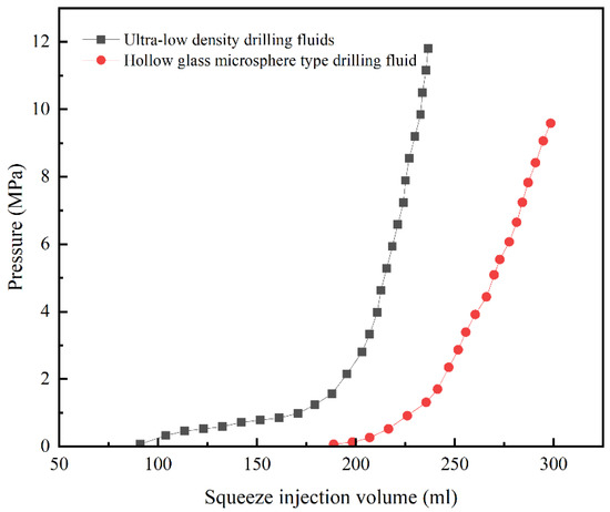 As can be seen from Figure 12 above, when 60–90-mesh sand beds (pore diameter is about 50–90 μm) are used, the pressure-bearing and plugging capacity of ultra-low-density drilling fluid can reach more than 12 MPa with less squeeze injection volume. The hollow glass microsphere drilling fluid can achieve a pressure-bearing and plugging capacity of more than 9 MPa in the sand bed experiment with the same number of meshes. Compared with the ultra-low-density drilling fluid, the hollow glass microsphere drilling fluid has a higher squeeze volume. This indicates that the pressure-bearing and plugging ability of the ultra-low-density drilling fluid is better than that of the hollow glass microsphere drilling fluid.