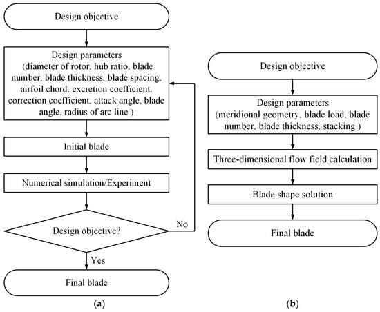 The flowchart of the SLM is shown in Figure 1a. The initial blade can be obtained by the design parameters, then numerical simulation and experiment are carried out to analyze the flow field and check whether or not the blade meets the design objective. If the design objective is not reached, the design parameters need to be re-selected, and the blade is redesigned until the design objective is met. The SLM is dependent on the design experience of engineers, and the pump designed by the method needs to be checked repeatedly. The circulation distribution from the hub to the tip is initially calculated based on the free vortex in Equation (1),