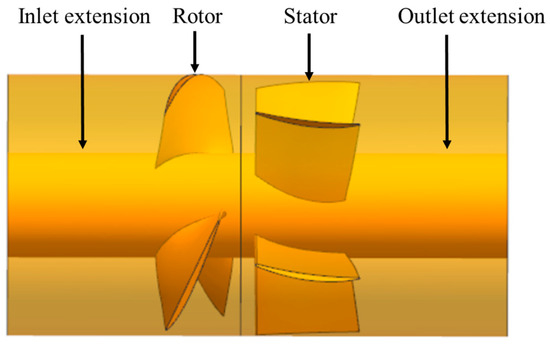 In this paper, two water jet propulsion pumps are studied. The two pumps are designed based on the streamline method and the blade load method, respectively. For the convenience of description, the two pumps are denoted as the SLM pump and the BLM pump, respectively. A three-dimensional model of the flow configuration is shown in Figure 3. It consists of four zones, i.e., the inlet extension, the rotor, the stator, and the outlet extension. The rotor and the stator in the SLM pump are designed by the streamline method, while the rotor and the stator in the BLM pump are designed by the blade load method. The inlet extension and the outlet extension are extended upstream and downstream of the blades by twice the axial chord length at the rotor hub to avoid backflows in the computational domain, which may cause difficulty in the calculation. The main geometrical parameters of the water jet propulsion pump are summarized in Table 2.