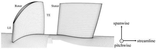 Structured grids are used for the calculation, with the H-type grids in the blade passage and the H-O grids in the blade tip clearance, as shown in Figure 5. For the convenience of description, the leading edge and the trailing edge in Figure 5 are denoted as LE and TE, respectively. The grids near the walls are stretched to capture the flow in the boundary layers. The distance between the first inner grid nodes to the wall, in terms of y+, is around 2, which meets the grid requirement of the SST k−ω turbulence model.