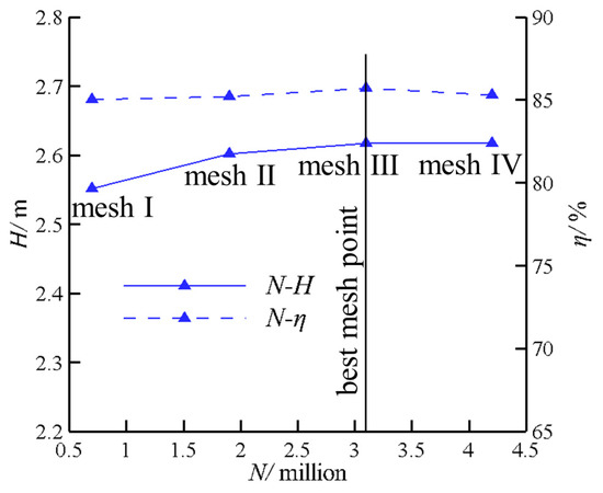 The head and the efficiency predicted by the four meshes for the BLM pump are plotted in Figure 6. The grids for the SLM pump are on the same level. It can be seen from Figure 6 that mesh III is fine enough to produce grid-independent results for the head and the efficiency. Their values remain constant when the mesh is further refined to mesh IV. Therefore, mesh III is employed in the following calculations.