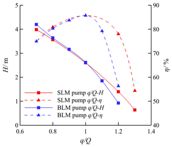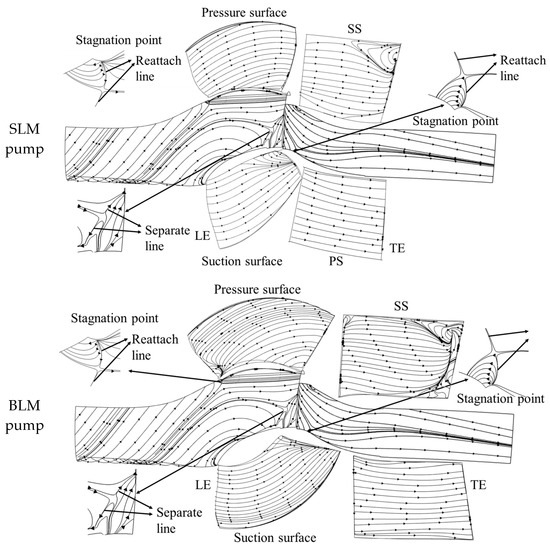 The internal flow fields without cavitation are first analyzed. The performance curves and limiting streamlines are included. Figure 7 shows the performance curves for the two pumps, where q is the flow rate at the operating points. It can be observed from Figure 7 that the head decreases as the flow rate increases, while the efficiency increases at first and then decreases. The head and the efficiency of the SLM pump drop slower than those of the BLM pump at large flow rates, which denotes a broader working range of high efficiency for the pump.