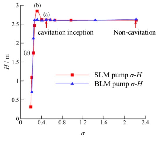 where varies due to the change of depth for the pump in water and is the circumferential velocity at the blade tip. The curves for the two pumps are plotted in Figure 9. It can be seen that the heads of the pumps initially remain constant. But when the cavitation number is decreased to a specific critical value, the heads drop sharply. An unexpected peak of the head is observed at point (b) in the SLM pump. On the other hand, the curve of the BLM pump is smoother. In order to further analyze the internal flow fields and cavitation of the propulsion pumps at different depths, the flow fields at three cavitation number values, i.e., , 0.319, and 0.246, and depicted as (a), (b), and (c) in Figure 9, respectively, are analyzed. For the point without cavitation, .