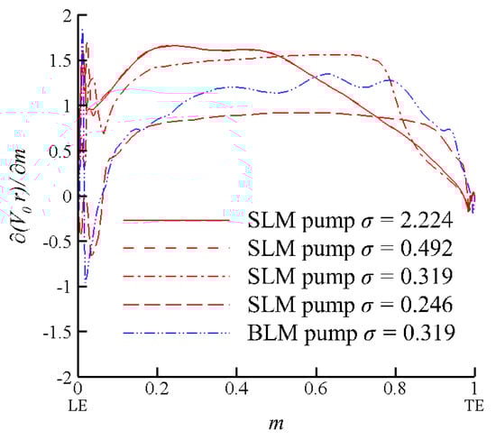 where and are the static pressure values on the pressure surface and the suction surface, respectively. is the projection component of relative velocity, is the dimensionless meridional distance from the leading edge to the trailing edge, and its value is between 0 and 1. is called blade load. Its integration along the meridional distance is the total velocity circulation from the leading edge to the trailing edge, as presented in Equation (15), which denotes the work-doing capacity of the blade. The relationship between the pump’s head and the velocity circulation [23] is presented in Equation (16). The angular speed of rotation is constant, so the pump’s head is proportional to the velocity circulation. The dimensionless distance between the hub and the tip, , is defined in Equation (17):