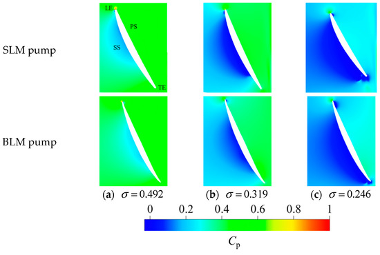 The area of the low pressure on the suction surface increases while the area of the high pressure decreases with the decrease of cavitation number. The pressure of the BLM pump is higher than that of the SLM pump, which is beneficial to suppress cavitation in the pump.