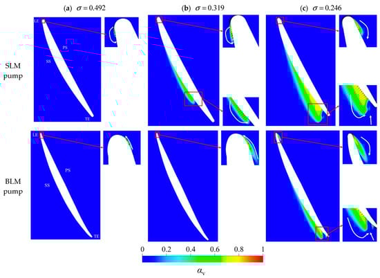Shown in Figure 13 is the spanwise distribution of vapor, where water is depicted by the color with while the bubbles are shown by the color with . The vapor distribution on the rotary surface is shown in the red box. It can be seen from Figure 13 that the cavitation bubble size is increased as the cavitation number decreases. For the SLM pump, no visible cavitation bubble is observed in the vicinity of the blade at . As the cavitation number decreases, the vapor on the suction surface of the blade expands from the leading edge to the trailing edge. At , the cavitation on the suction surface expands further, and the vapor starts to appear at the leading edge of the pressure surface, as shown in Figure 13c.