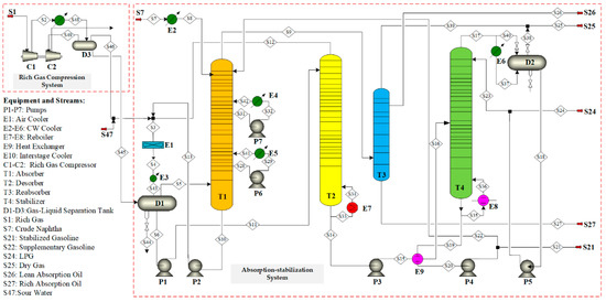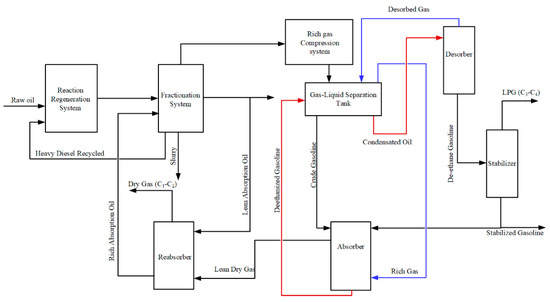 Currently, crude oils are getting scarcer and more expensive, and the need for light oil is continually rising. Oil deep processing, especially under cost-effective energy management, is essential. The FCC unit is a significant deep processing procedure for crude oil, a high-energy-consuming component of a fuel-based refinery, and is undergoing extraordinary development [1]. The FCC is the modern refinery’s mainstay on a global scale. Its purpose was to transform heavy hydrocarbon petroleum compounds into a variety of more usable products, including petrol, intermediate distillates, and light olefins [2]. The product from the FCC reaction is then separated into rich gas, unsaturated gasoline, light diesel oil, re-refined oil, and oil slurry based on the various boiling point ranges of the distillates, while also making sure that the dry point, freezing point, and flash point of light diesel oil are acceptable [3]. Compressed-rich gas (H2, CO, CO2, C1–6 components) and crude gasoline are distillated from the top of the main fractionation tower are commonly co-processed in ASS. Prior to ASS, a two-stage turbine was used to compress the rich gas to the required pressure for the subsequent operation. In particular, the dry gas (C2− components) and liquefied petroleum gas (LPG, C3–4 components) are separated from the compressed rich gas, while the stabilized gasoline is upgraded from crude gasoline in this process [4]. The ASS comprises four columns: absorber, desorber, reabsorber, and stabilizer [5,6]. As the ASS consists of four recycles with substantial flow rates, the interaction between the various process parameters is intense. As an illustration, the absorber and desorber interact closely because they feed each other. Specifically, the rich absorption oil from the absorption tower is the liquid feed for the desorption tower. Likewise, the desorbed gas from the desorption tower is recycled as the gas feed to the absorption tower, as shown in Figure 1. The system’s temperature and pressure influence the absorption and desorption effects. There is a tradeoff between desorbed gas quantity, dry gas quality, and LPG quality [7]. Chen et al. [8] introduced a novel GASP to enhance the separation process and greatly simplify the existing GASP flowsheet. They analyzed the solubility and volatility of the C5–C11 hydrocarbons in their study and introduced a new indicator to reflect the effectiveness of additional absorbent streams. Pan et al. [9] presented a rigorous dynamic simulation of the fluid catalytic cracking unit’s (FCCU) absorption-stabilization system.