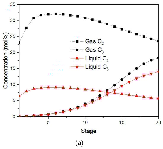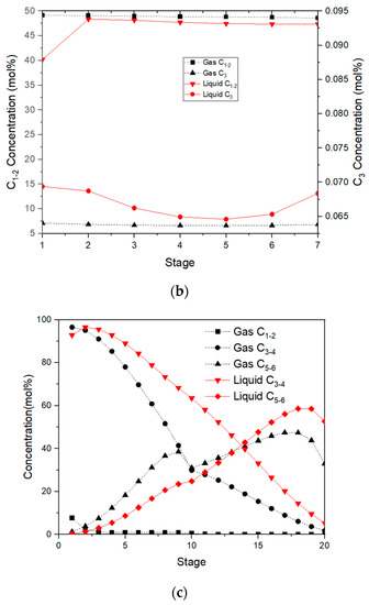 Ethane and ethylene concentrations for the absorption tower are depicted in Figure 4a as steadily increasing from bottom to top, but propane and propylene concentrations are the opposite. The lean dry gas (S9) from the top of the absorption tower will carry part of the absorbent. In order to recover this part of the absorbent, lean absorption oil with light ends of components similar to naphtha is used as a re-absorbent to recover naphtha. It can be seen from Table 2 that the boiling point ranges of naphtha and lean absorption oil overlap, which means that their components are similar. Part of the C2- components can be dissolved in the absorbent, resulting in a decrease in the C2- concentration in the early stages of the absorber, as shown in Figure 4a.