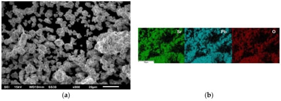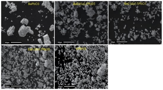 The microstructure of the material surface was studied using scanning electron microscopy by means of a JEOL JSM—6610 LV (Tokyo, Japan) instrument with an energy dispersion X-ray spectrometer for chemical microanalysis purposes. The surface morphology was studied by gluing carbon tape onto the samples; carbon tape was not used in the chemical analysis of the samples. The study was carried out using a low vacuum detector at an accelerating voltage of 15 kV and different magnifications of the image (50–1500×). EDS with a Si(Li) X-ray detector (Oxford Instruments, Abingdon, UK) was used to investigate the homogeneity of the samples. Microphotographs, of a 250× magnification of (Ba1−xSrx)PbO3 perovskites powders, are shown in Figure 1. The ceramic powders were fine and dense, with a grain size estimated at 15 microns for those with Sr2+ concentrations from 0.5 to 1. For concentrations of x ≤ 0.5, some bigger grain sizes, ca. 50 microns, were observed. The composition analysis by EDS showed no presence of impurities in the final ceramics, for example, as seen in Figure 2. The mapping analysis carried out proved that the obtained samples were homogeneous with a uniform distribution of atoms. An example of SrPbO3 mapping specifically for Sr, Pb, and O elements is shown in Figure 2b.