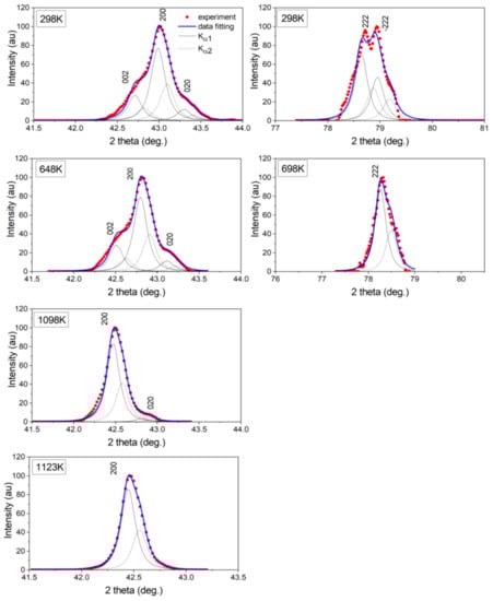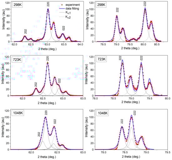The type of distortion from an ideal cubic perovskite structure was determined using the diffraction lines splitting method and Glazer’s analysis, described elsewhere [20]. The pseudocubic distortion was determined, and cell parameters were calculated based on the splitting of the major selected diffraction lines, such as {200}c, {220}c, {222}c. Figure 3 shows the temperature evolutions of {220}c and {222}c reflections for selected 298 K, 723 K, and 1048 K temperatures. Figure 3 shows raw and fit data with Kα1 and Kα2 lines. Using data from the literature published elsewhere [20], the consideration of the number of main splitting diffraction lines and the analysis of the superstructure lines made it possible to solve the perovskite structure. Therefore, in this paper, the terminology used by Glazer for the classification of space groups and symmetries associated with each of the tilting types is applied. Based on the relationship between the number of major pseudocubic diffraction lines and the given crystallographic system, and the octahedra tilting type for given distortions [44], the distortions and perovskites symmetry were determined.