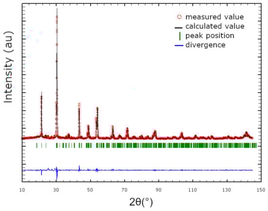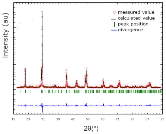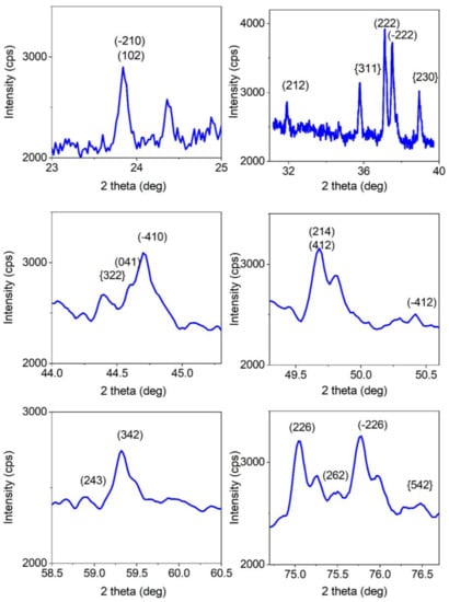 The splitting of the main diffraction lines enabled the determination of the type of unit cell distortion, both at RT and high temperatures. Moreover, additional weak lines with half-Miller indices in the pseudocubic system were observed, as shown in Figure 4. Those lines are called superlattice lines, and the powder pattern data on their observation at RT are collected in Table 1.